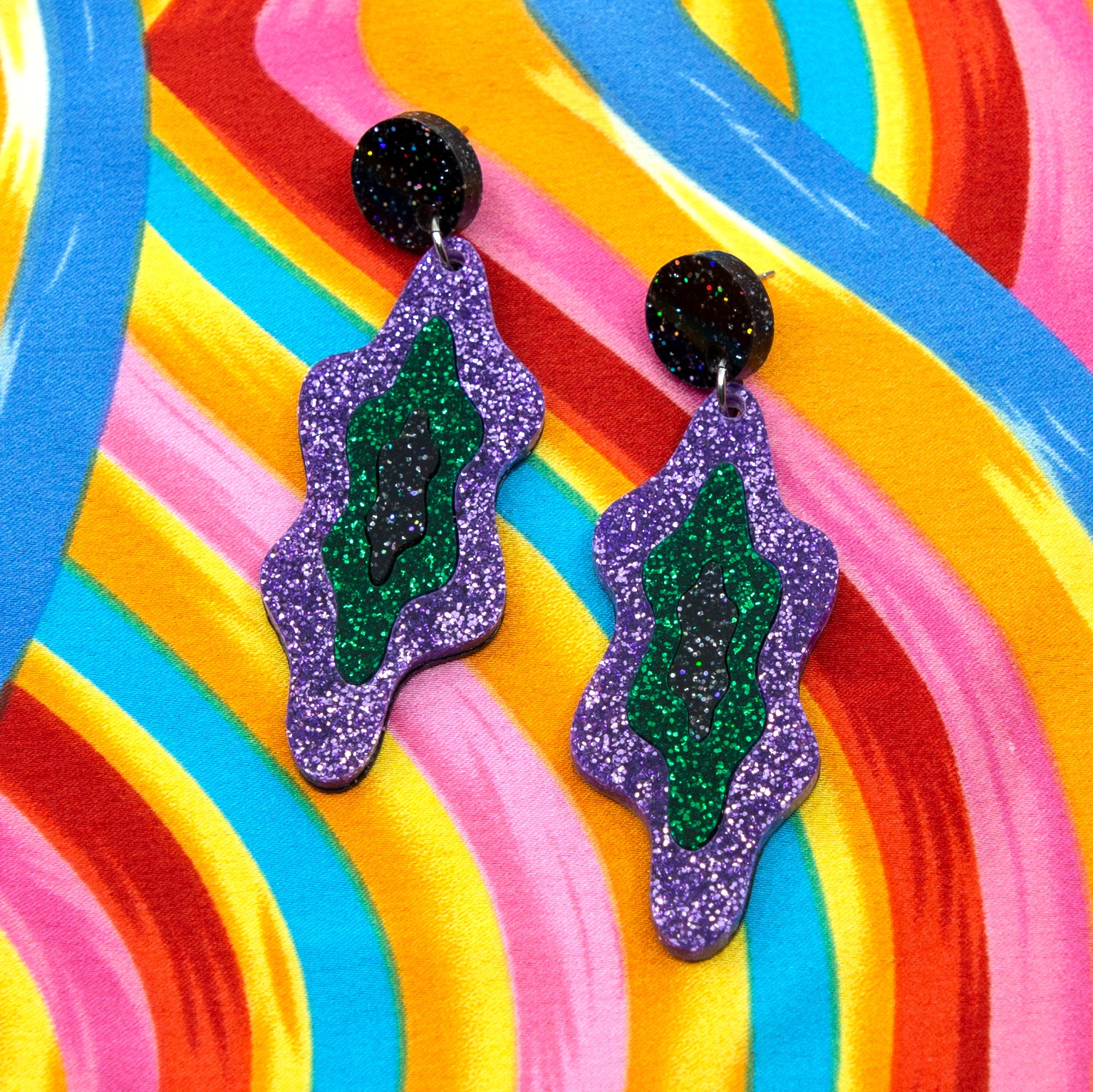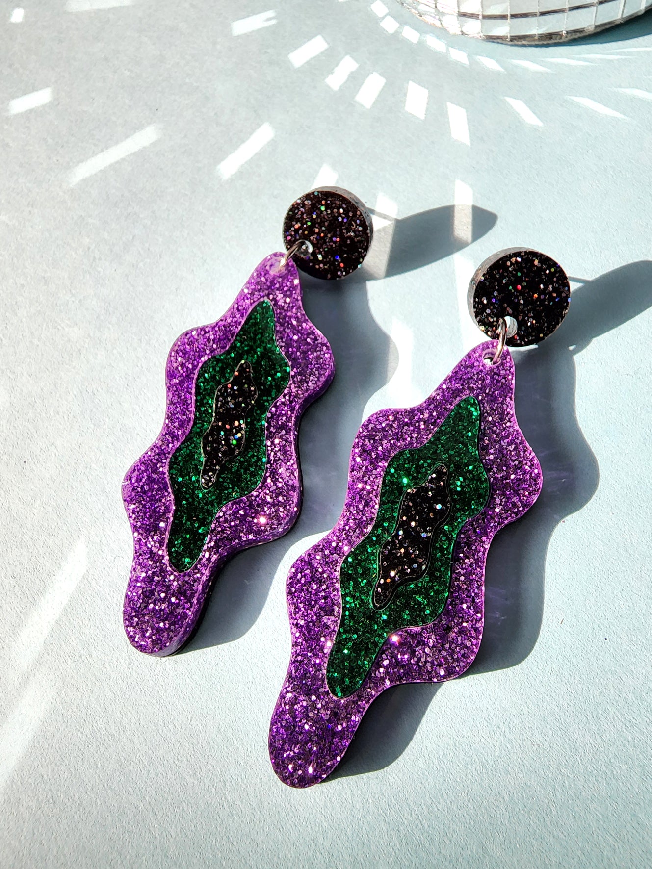 Lilac glitter, emerald glitter, black glitter and black glitter stud