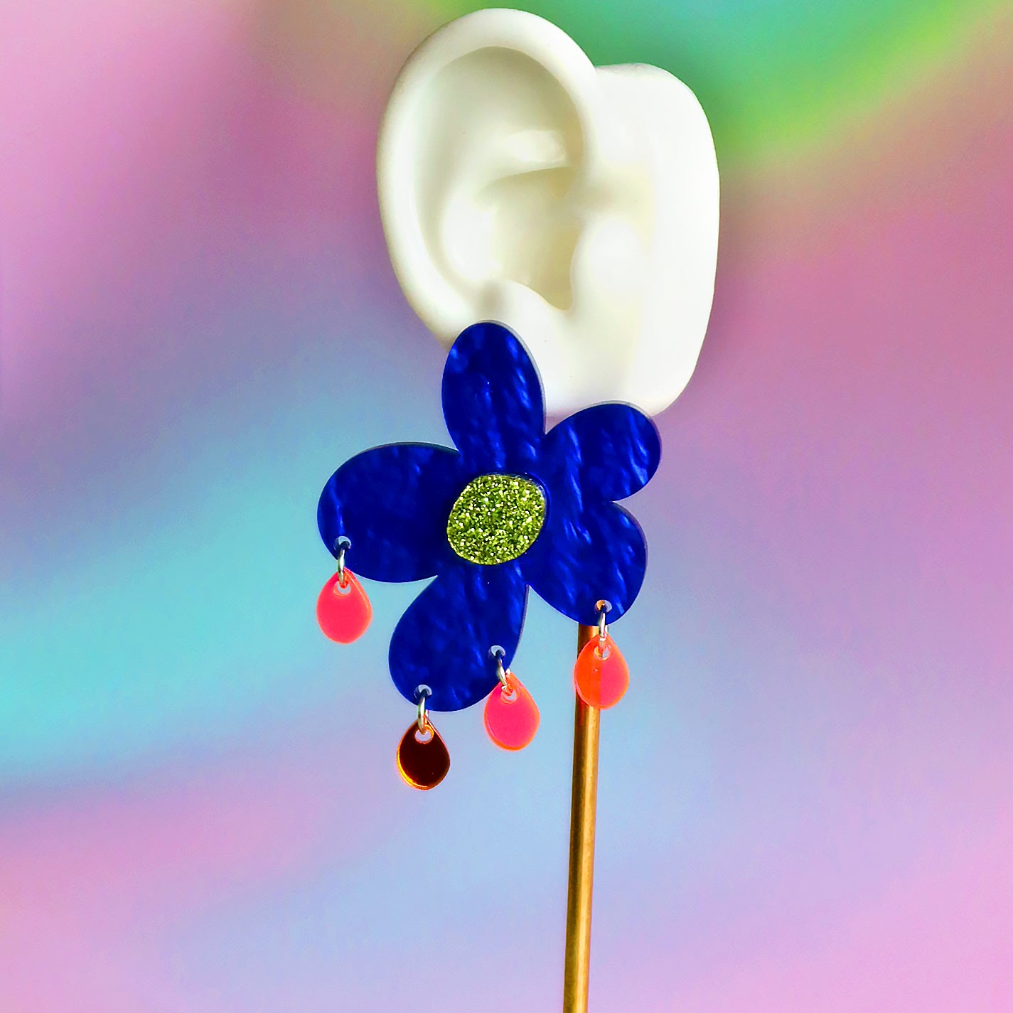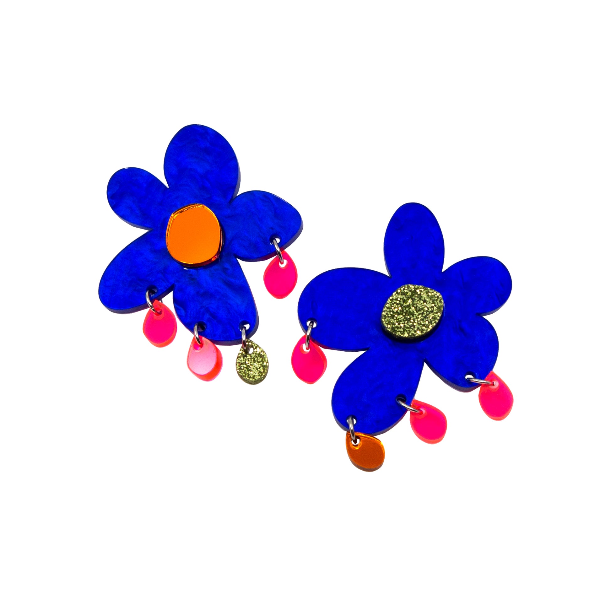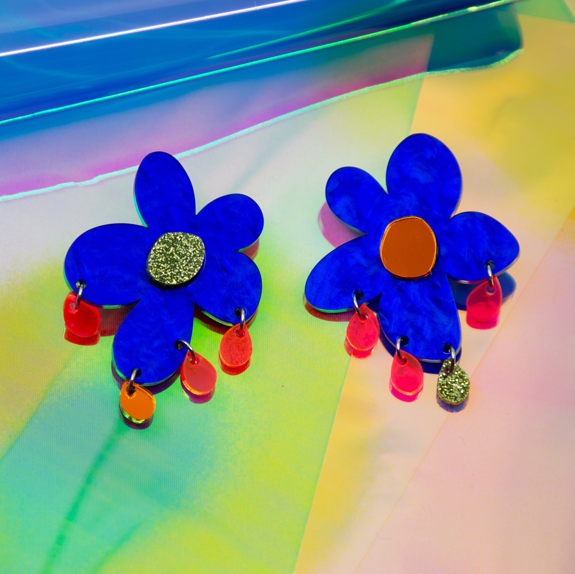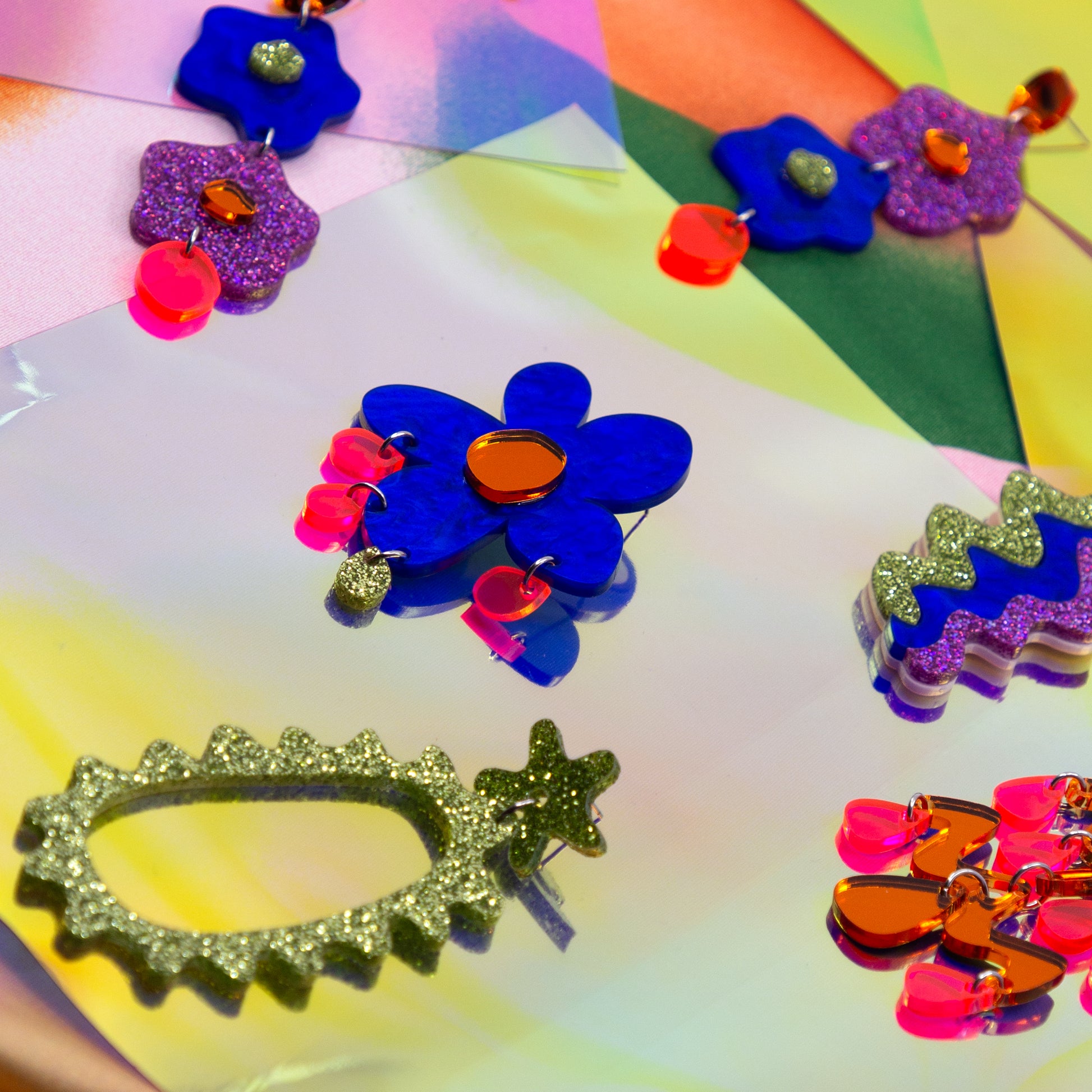 Large flower acrylic earring, featuring glitter green, orange mirror, and fluorescent transparent pink.