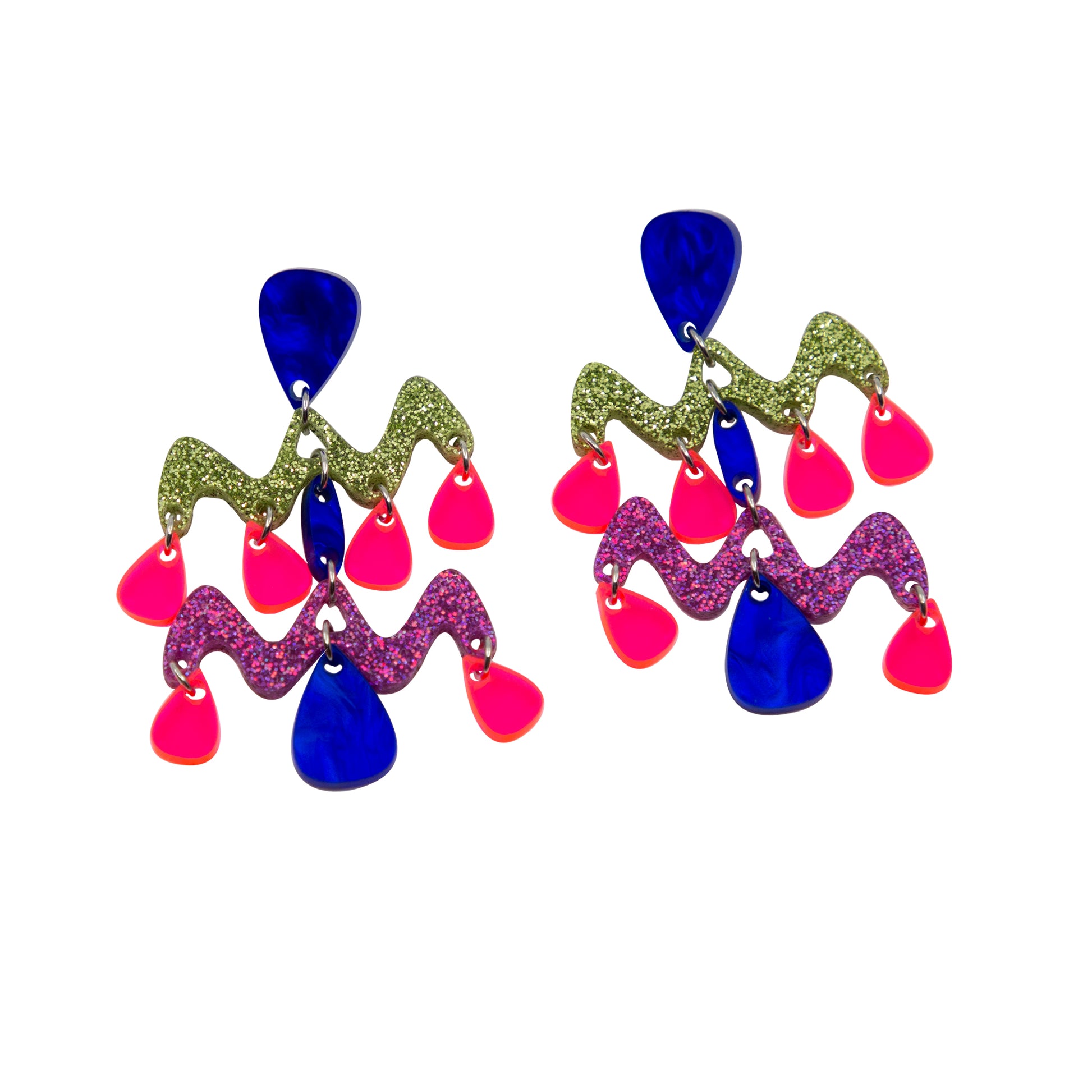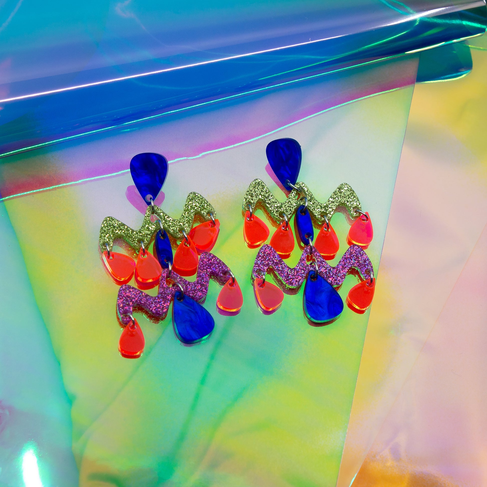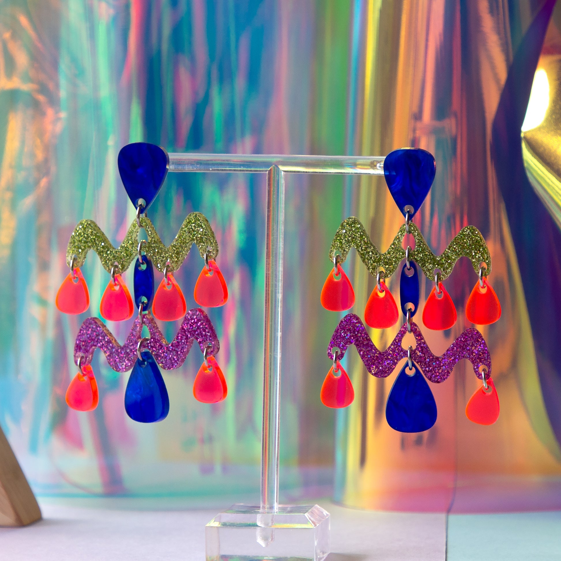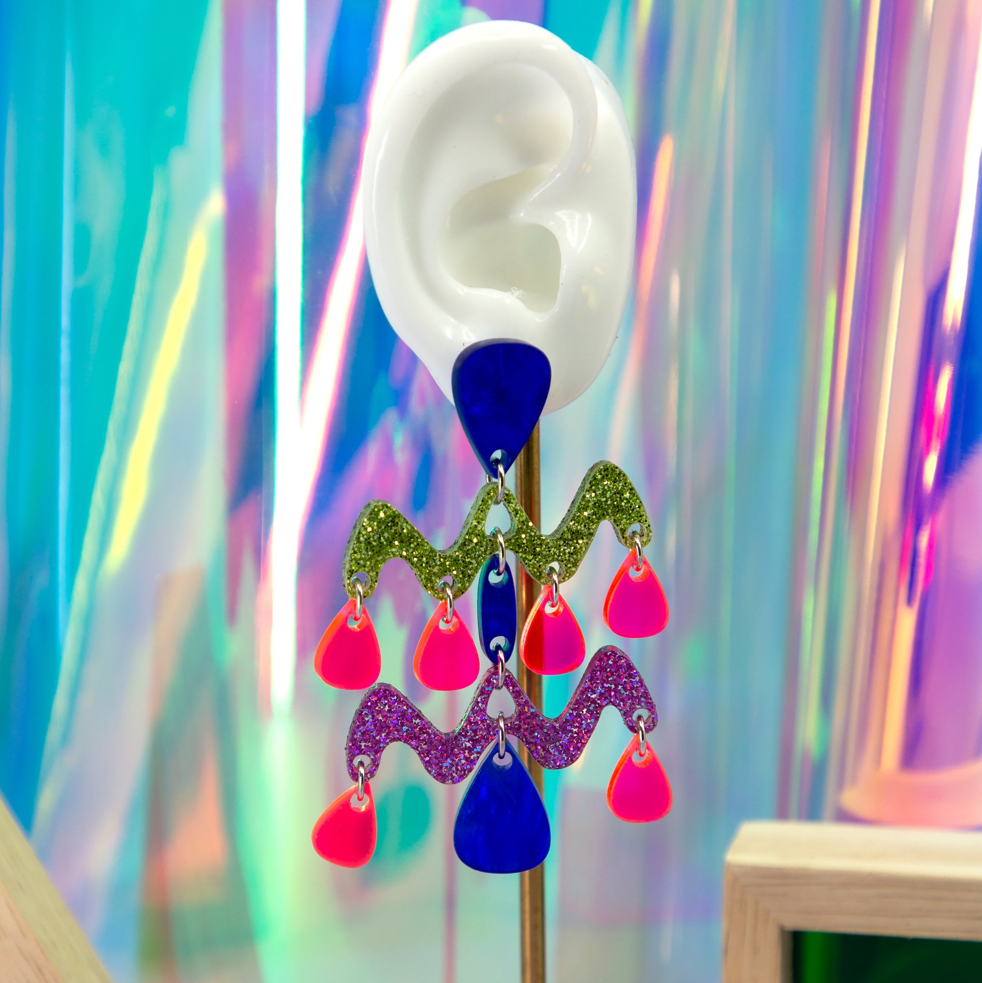 Large chandelier style acrylic earring, featuring blue marble, green and pink glitter and fluro transparent pink.