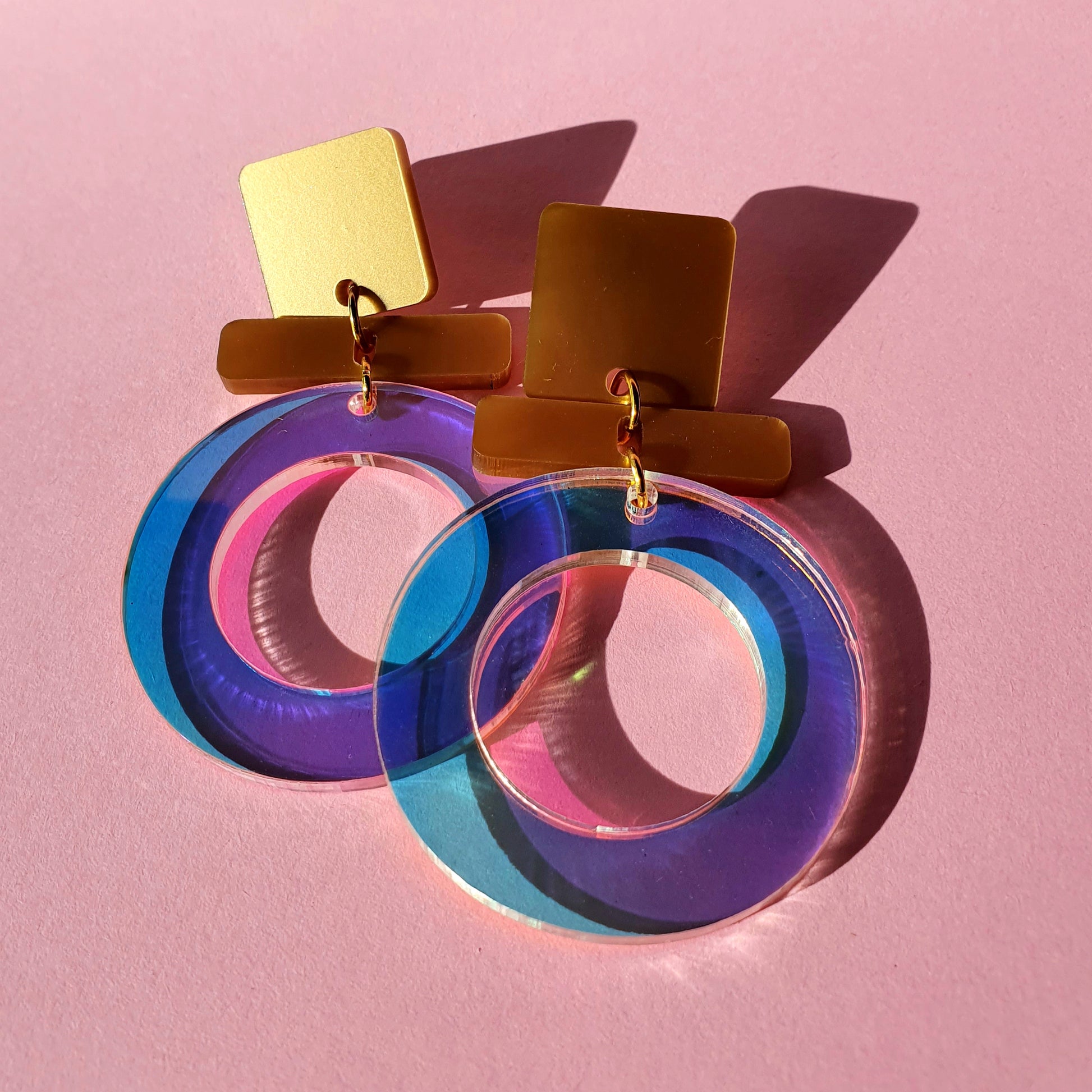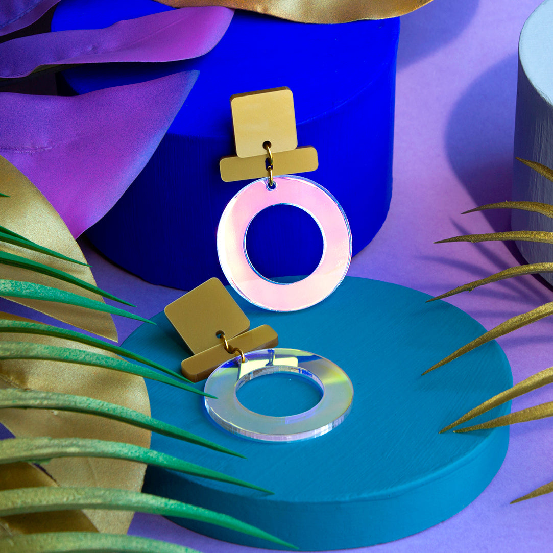 Iridescent acrylic changes colour depending on the light and angle. Colours include blue, green, yellow, orange, pink and purple.