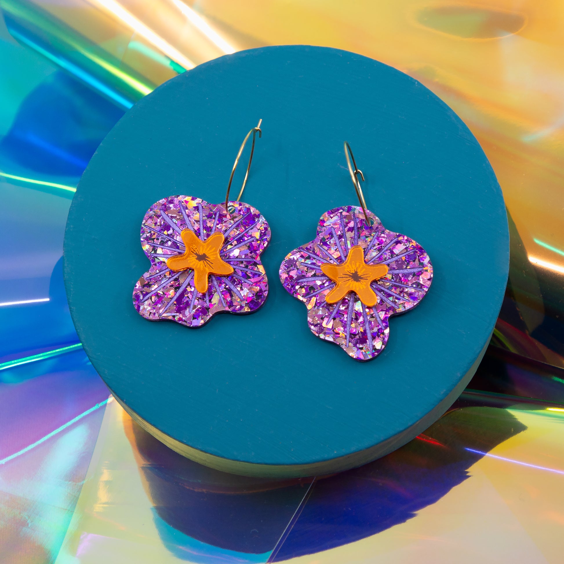 Pink glitter flower with metallic purple fill & orange mirror centre. Acrylic is randomised in pattern. Each object may vary slightly.