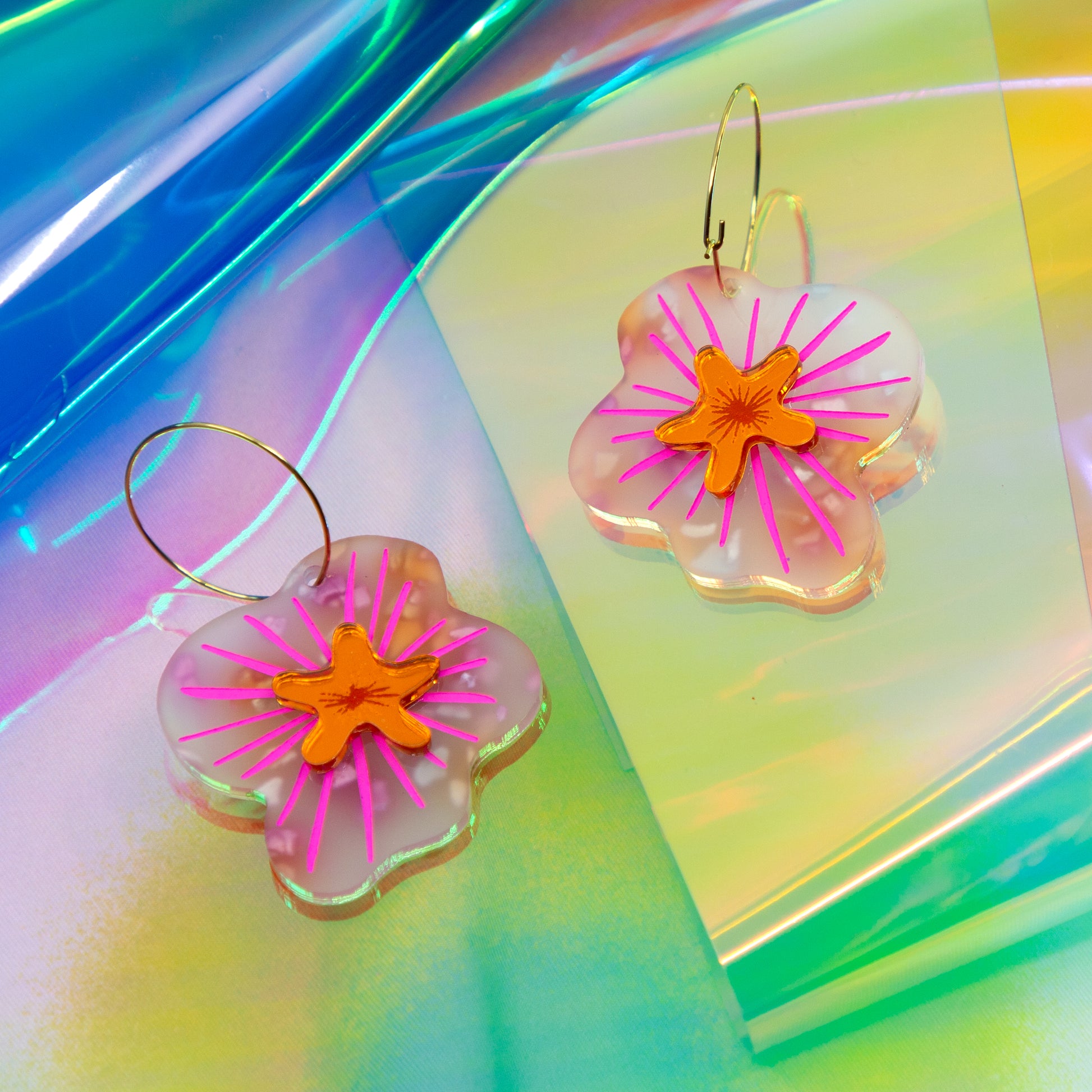 Petal pink translucent flower with fluro pink fill & orange mirror centre. Acrylic is randomised in pattern. Each object may vary slightly.