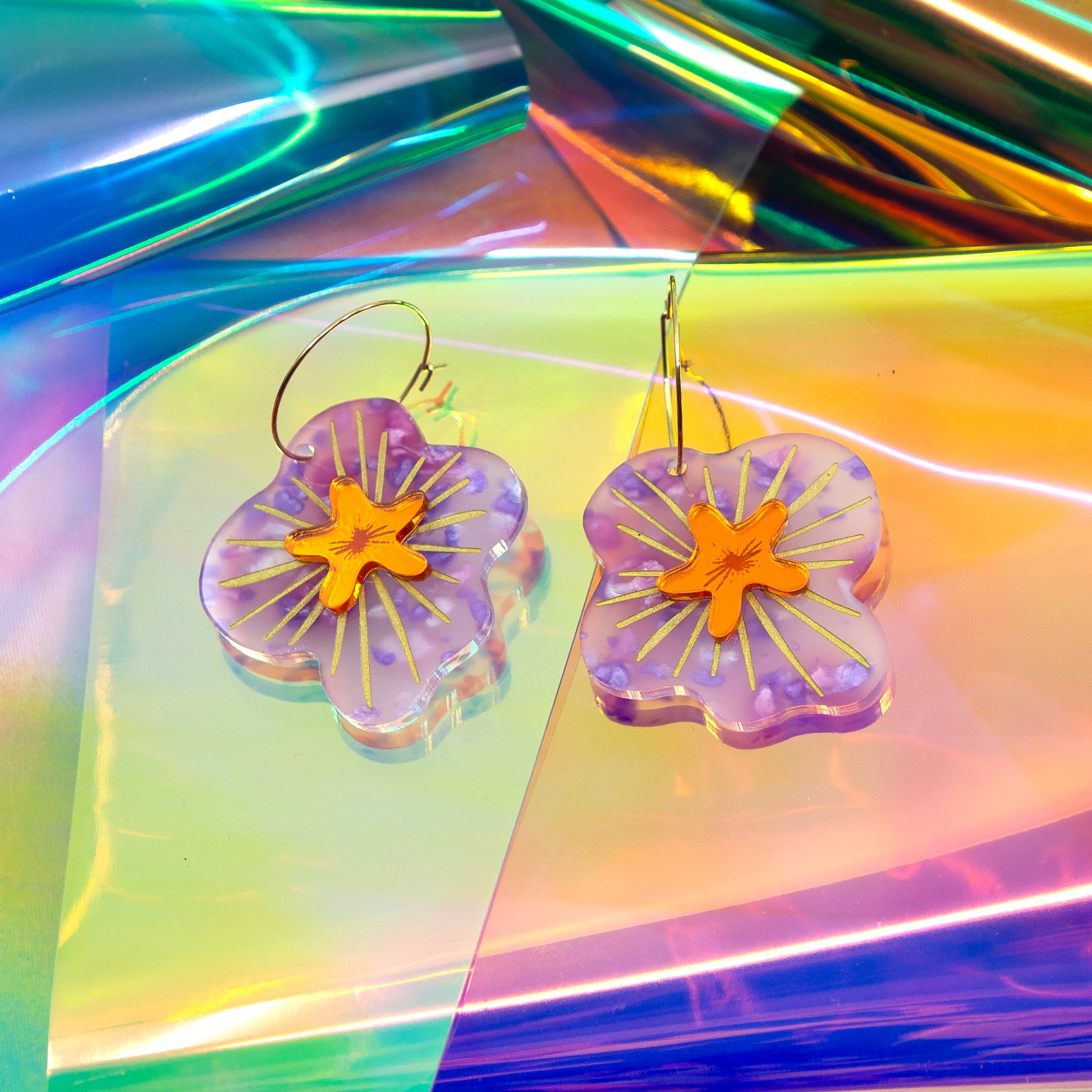 Petal purple translucent flower with gold fill & orange mirror centre. Acrylic is randomised in pattern. Each object may vary slightly.