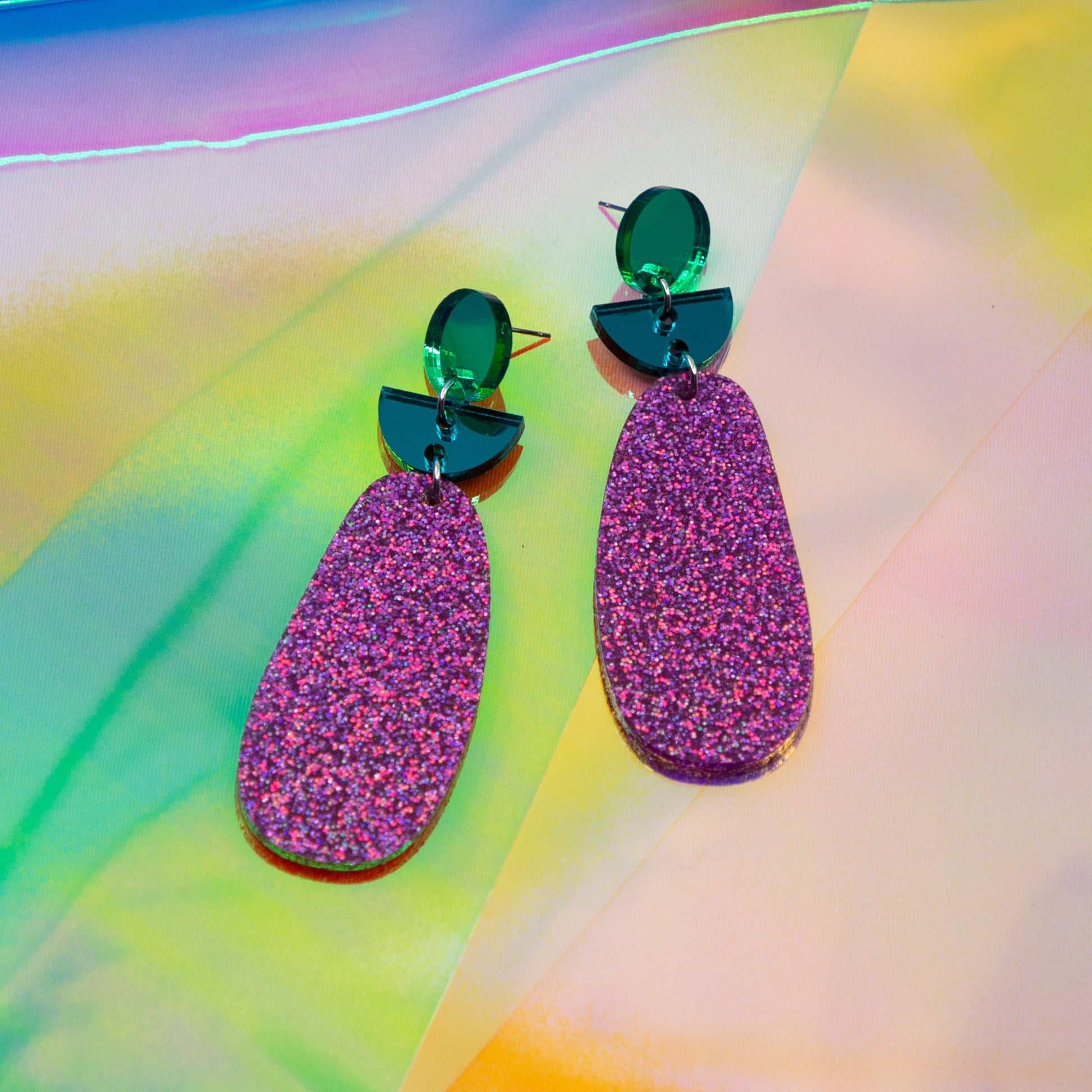Light weight, statement acrylic earrings featuring green mirror stud with teal and pink holographic pink glitter.